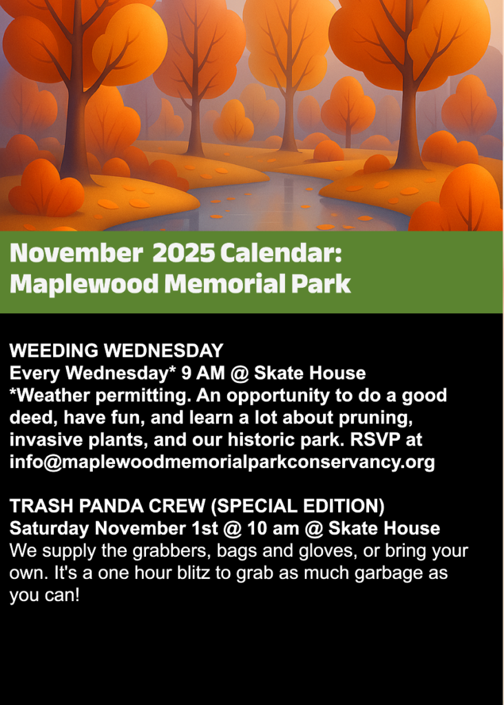The Maplewood Memorial Park Conservancy is a volunteer, non-profit, 501 (c) (3) organization established in 2017. It works in public-private partnership with the Township of Maplewood in developing long-term plans and caring for, restoring, and improving our historic local gem, Memorial Park, which is a Maplewood landmark and is listed in the State and National Register of Historic Places. The park, a twenty-five acre oasis in the center, and at the heart, of town, was designed in the early twentieth century by the prominent landscape architects Brinley and Holbrook and the Olmsted Brothers firm.