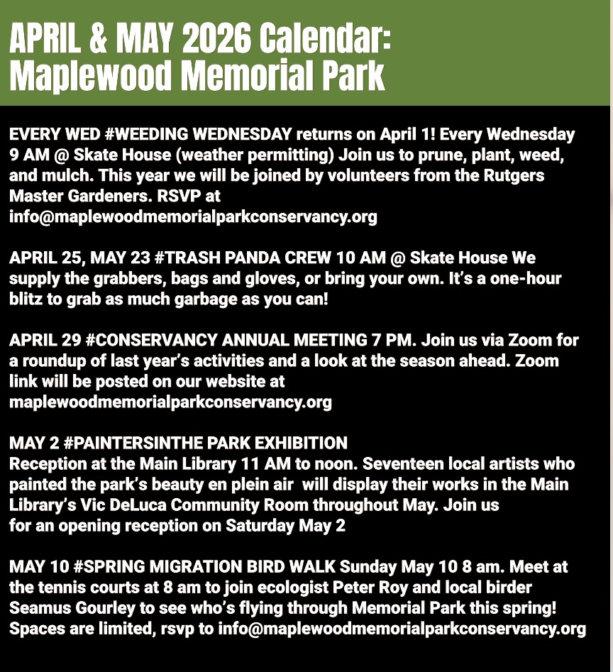 The Maplewood Memorial Park Conservancy is a volunteer, non-profit, 501 (c) (3) organization established in 2017. It works in public-private partnership with the Township of Maplewood in developing long-term plans and caring for, restoring, and improving our historic local gem, Memorial Park, which is a Maplewood landmark and is listed in the State and National Register of Historic Places. The park, a twenty-five acre oasis in the center, and at the heart, of town, was designed in the early twentieth century by the prominent landscape architects Brinley and Holbrook and the Olmsted Brothers firm.